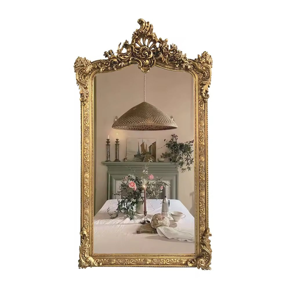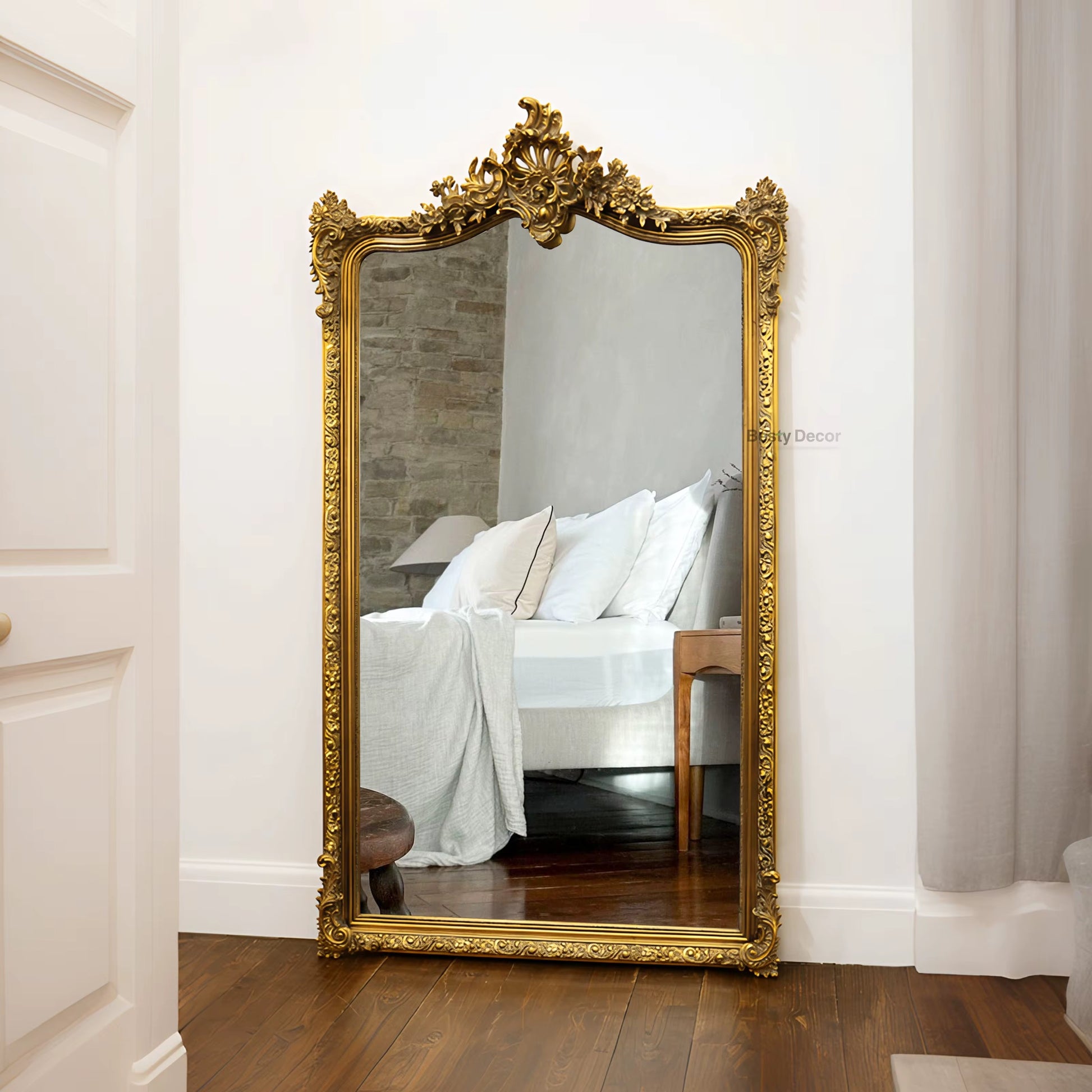Elevate your space with this stunning baroque-style gold floor mirror, featuring exquisite hand-carved detailing and a rich antique-gold finish. Its grand full-length size makes it a striking centrepiece for bedrooms, dressing rooms, hallways, and luxury living spaces.