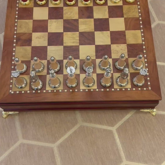 The chessboard itself rests on an ornate wooden base with gold-finished corner feet, embodying a regal sophistication that makes it as much a statement décor piece as a game of intellect.